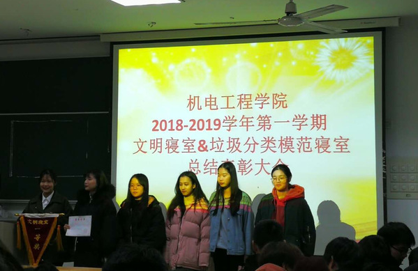 辅导员陈翔飞对本次“文明寝室”和“垃圾分类模范寝室”的评比规则和流程做了说明,对员工会生活部同学在评比过程中的付出表示感谢,强调了本次活动的积极意义。随后,范洪梅老师宣读获奖名单,并与叶云霞老师一起为获奖寝室颁奖。大会共表彰“文明寝室”12间,“垃圾分类模范寝室”6间。对受表彰的寝室给予精神和物质的双重奖励,既有锦旗和奖状也有日常生活用品。