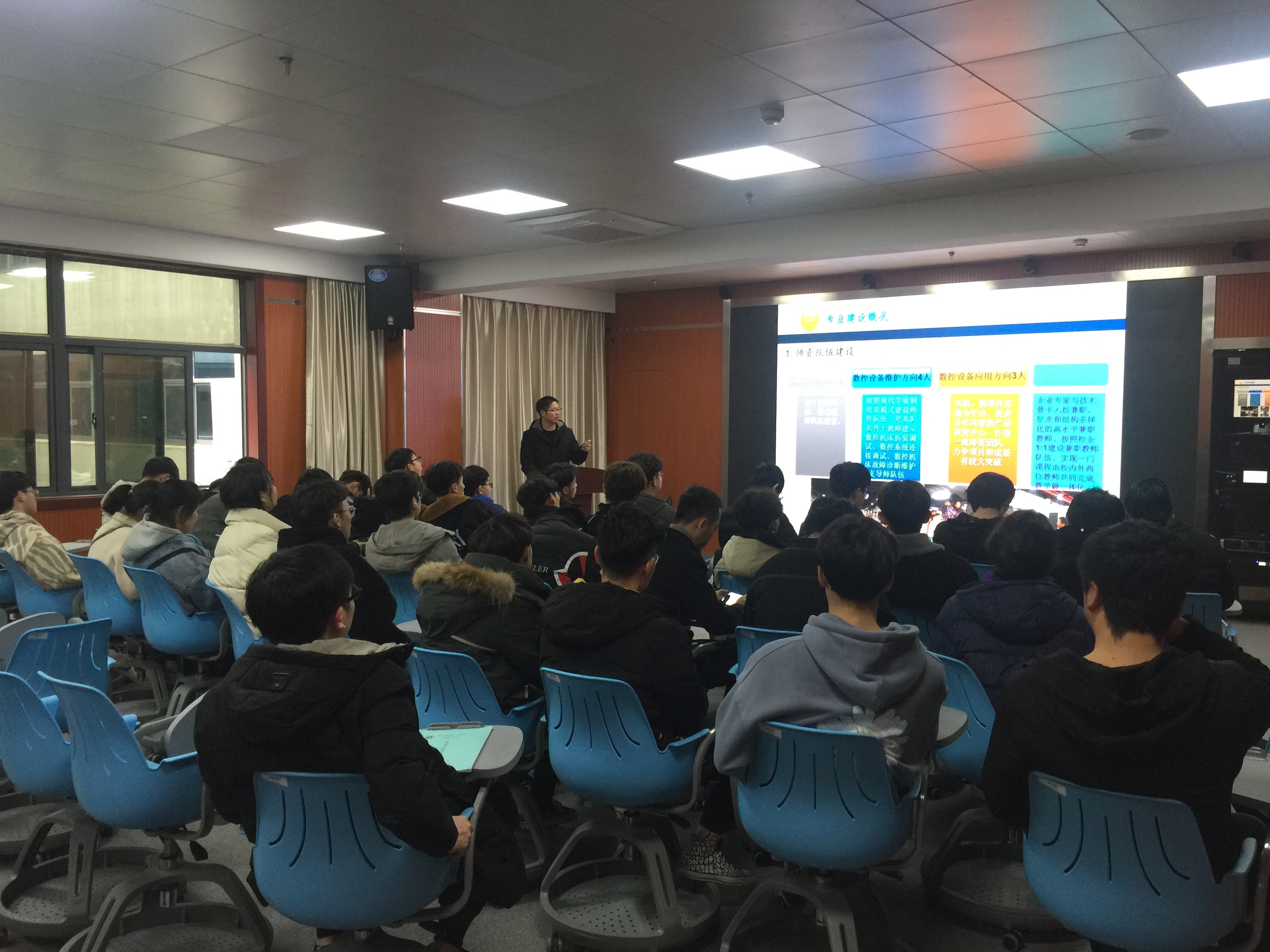数控设备应用与维护专业主要从专业团队概况、实训室概况、专业人才培养方案、课程设置、员工获奖、顶岗实习、就业签约等方面向专业大二员工作了介绍,着重以近3年专业员工的顶岗实习和就业签约单位为例,针对同学们关心的顶岗实习和就业问题作了较为详细的解答,向同学们说明专业员工的就业去向。