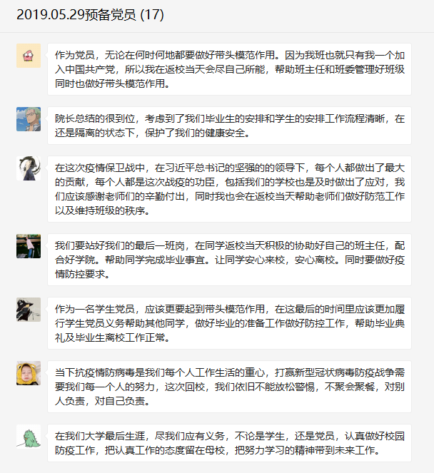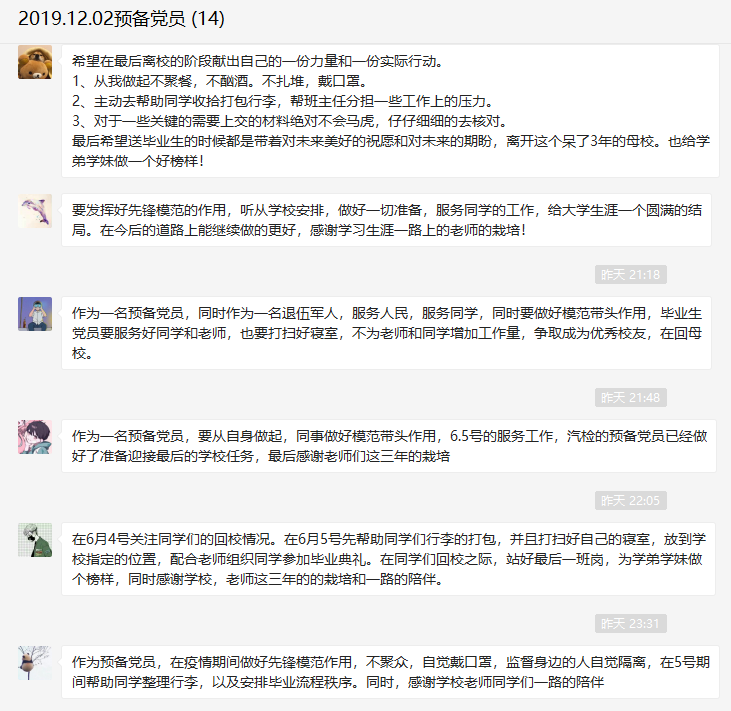 往年,毕业生返校之际,太阳成集团tyc234cc党总支会在毕业生党员离校前召开员工党员座谈会,做好毕业生党员思想教育工作和安全教育。今年,因为疫情影响,员工们返校时间短,任务重,留给大家坐在一起交流的时间很少。但党员的思想教育不能缺席,为了上好员工离校前最后一次党课,太阳成集团tyc234cc党总支创新形式,于2020年5月28日晚7点,组织全体毕业生党员,相约云上,举行了一场别开生面的线上座谈会。