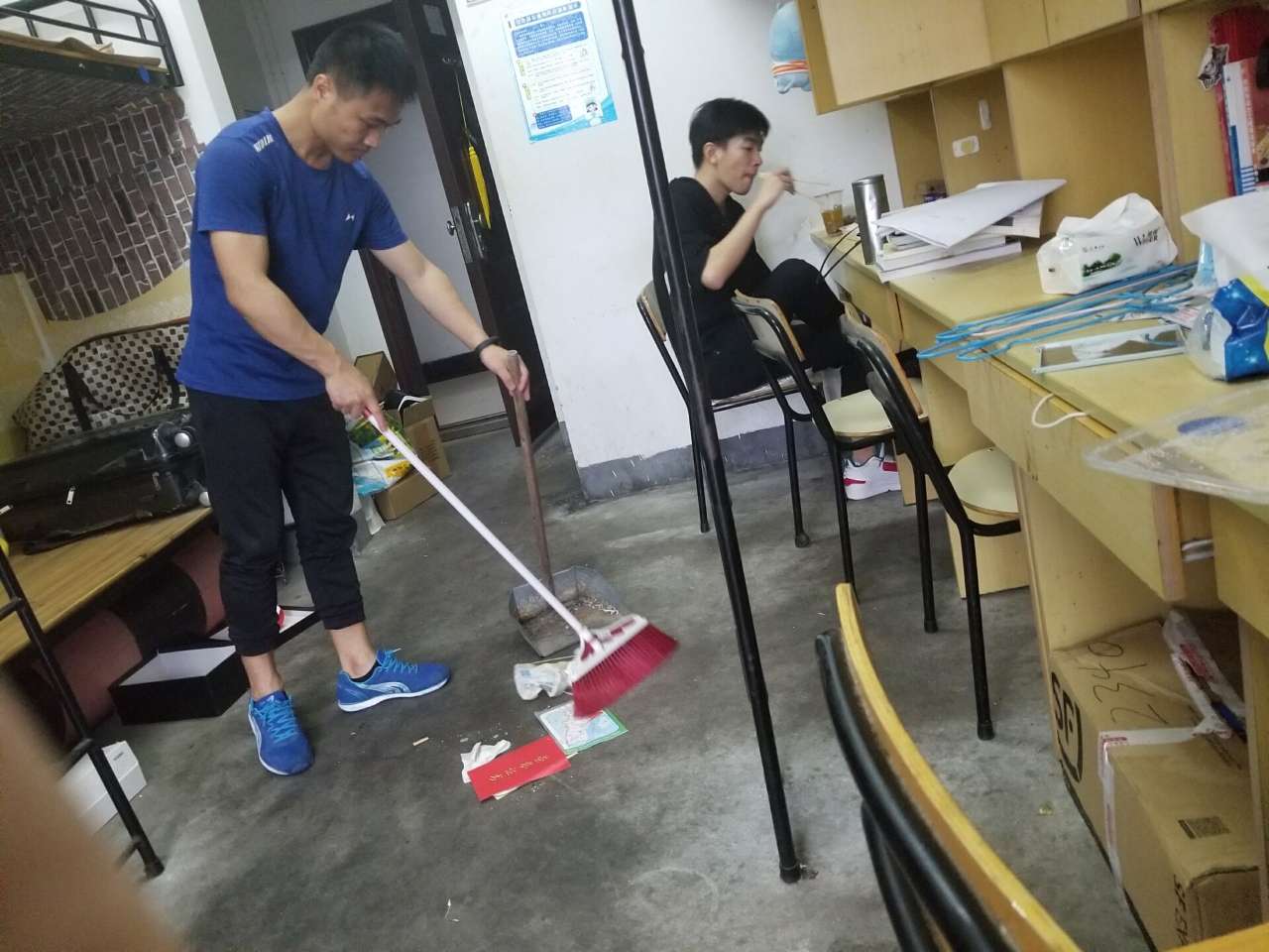 齐泳斌、胡伟超、谢加军帮忙打扫班级寝室卫生。