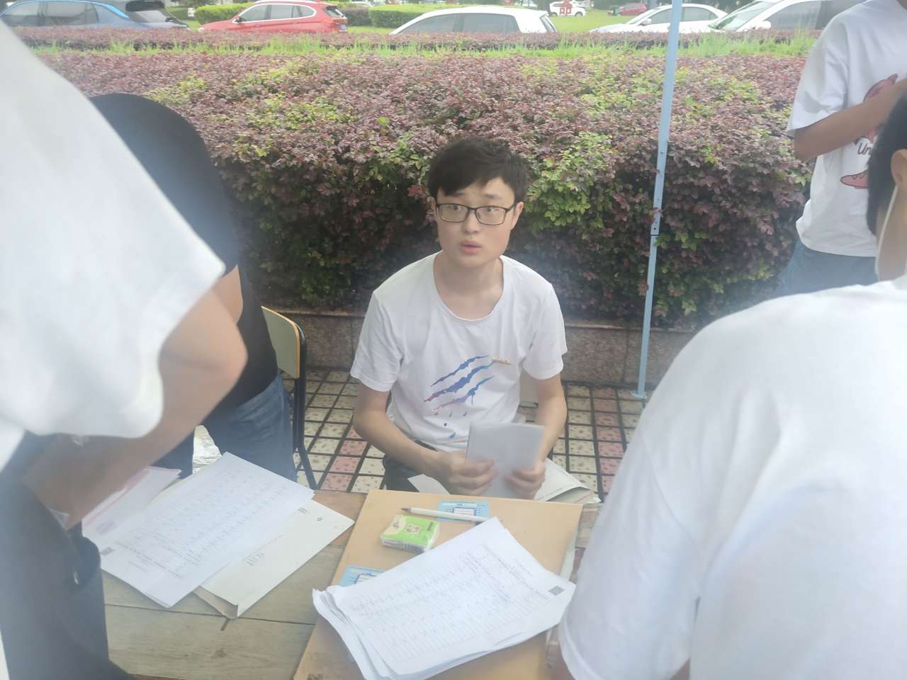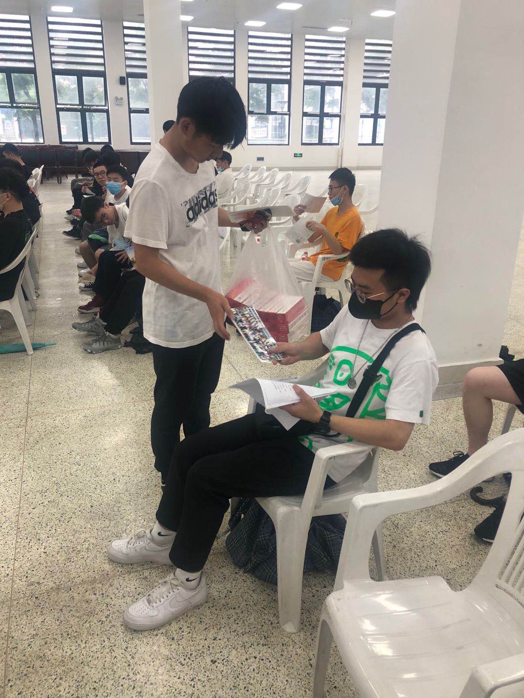 刘国强、徐伟恺、田加伟、冯斌、严雪莲帮班主任分发材料。