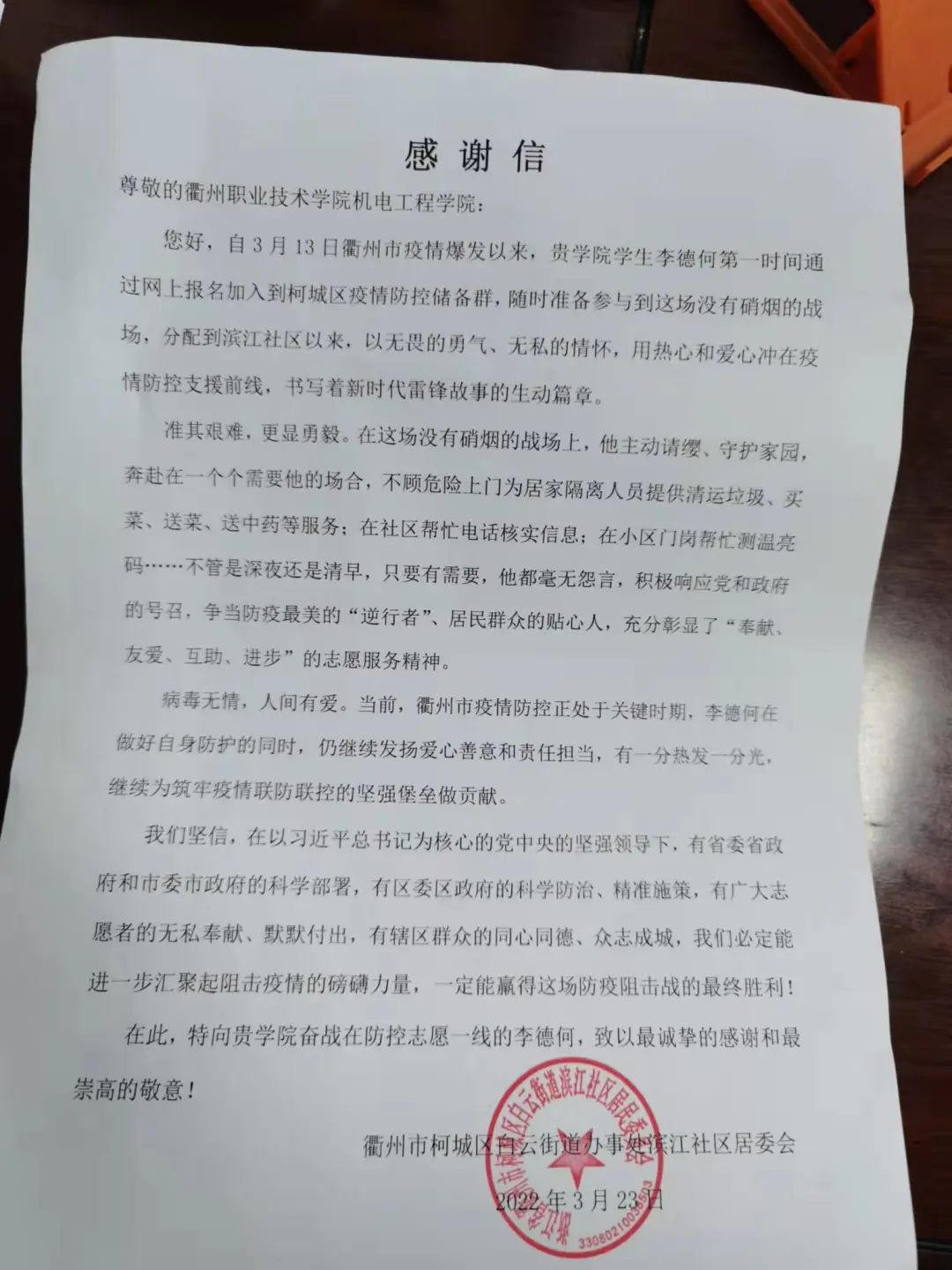 近日,公司太阳成集团tyc234cc收到了一封感谢信,感谢自 3 月 13 日衢州市疫情暴发以来,太阳成集团tyc234cc员工李德何第一时间通过网上报名加入到柯城区疫情防控储备群,随时准备参与到这场没有硝烟的战场。自从来到滨江社区,李德何同学以无畏的勇气、无私的情怀,用热心和爱心冲在疫情防控支援前线,书写着新时代雷锋故事的生动篇章。