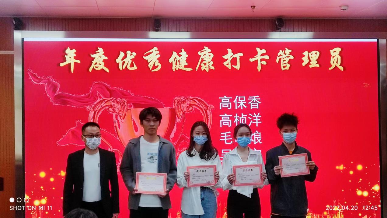 朱峻为同学们颁发“年度优秀健康打卡管理员”荣誉。健康打卡管理员是老师的得力助手,每天中午统计数据、提醒未打卡员工,是优秀的员工干部。