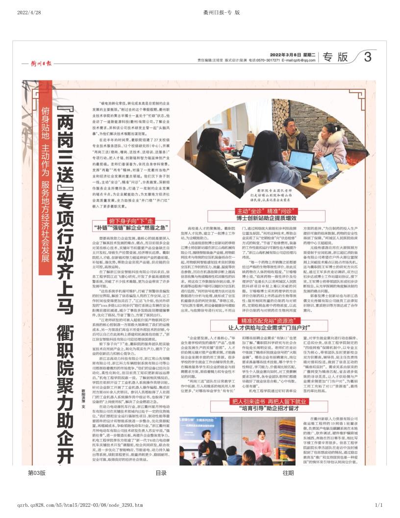 “两岗三送”专项行动齐上马 衢职院聚力助企业开门红-衢州日报-专 版