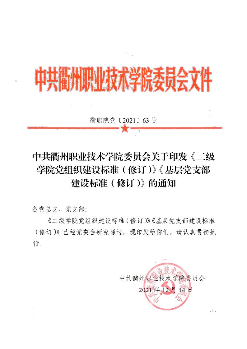 衢职公司党〔2021〕63号中共太阳成集团tyc234cc委员会关于印发《二级公司党组织建设标准(修订)》《基层党支部建设标准(修订)》的通知