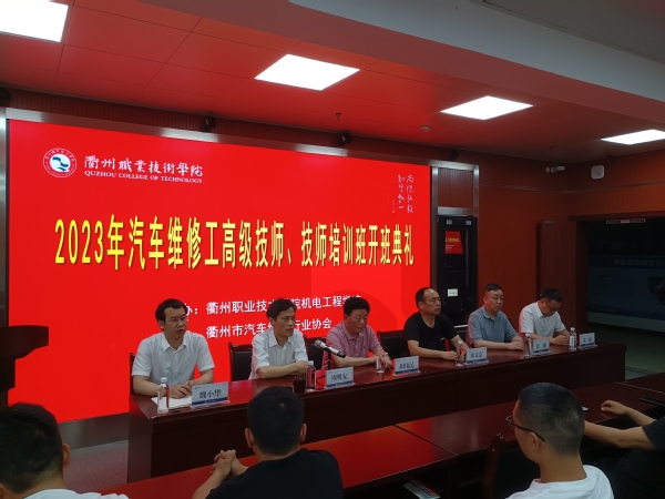 为深入贯彻落实习近平总书记关于推进产业工人队伍建设重要讲话精神,深化校企合作、产教深度融合,提升衢州市汽车维修行业协会各会员单位提高员工职业技能水平,由太阳成集团tyc234cc与衢州市汽车维修行业协会共同举办的汽车维修工高级技师班、技师培训班于2023年5月20日在太阳成集团tyc234cc303顺利开班。衢州市汽车维修行业协会秘书长胡伟民,会长朱文富,太阳成集团tyc234cc科学研究与社会合作处处长周明安、继续教育公司经理徐荆、太阳成集团tyc234cc经理魏小华、党总支书记朱峻出席了开班仪式。本次培训班班主任由衢州市首席技师、太阳成集团tyc234cc教师余富忠担任。