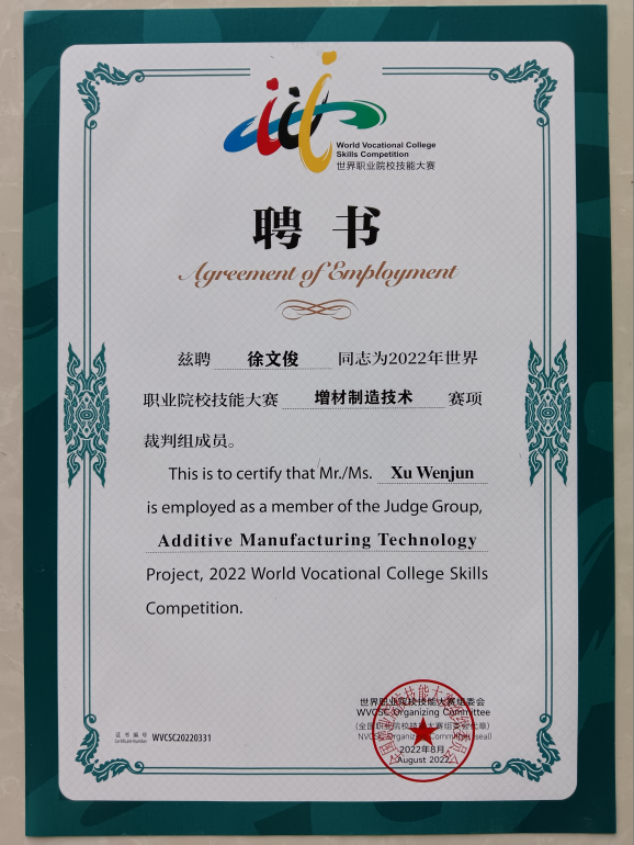 徐文俊同志被聘为2022年世界职业院校技能大赛“增材制造技术”赛项裁判组成员。