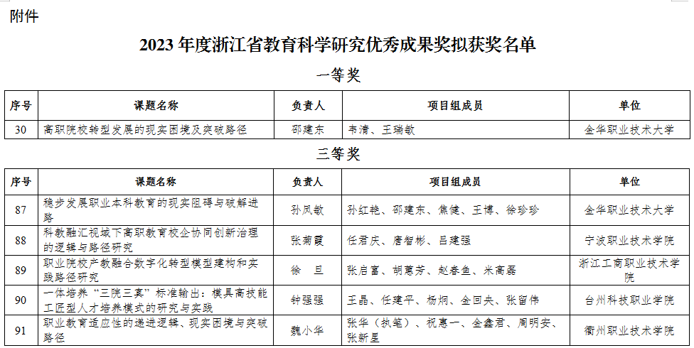 据悉,浙江省教育科学研究优秀成果奖每年组织一次评选,申报的成果必须是省教育科学规划办立项的重大、重点、年度规划、体卫艺、党建等各类专项课题、认定性课题或全国教育科学规划办立项的各类课题成果。2024年,经地市教科规划办、有关高校和单位推荐,浙江省教育科学规划领导小组办公室组织专家对选送的2023年度浙江省教育科学研究优秀成果材料进行学术不端检测、活页评审、会议评审等程序,共有182项成果拟获2023年度浙江省优秀教科研成果奖,其中一等奖31项,二等奖59项,三等奖92项。全省高职院校共有6项成果获奖,其中一等奖1项,三等奖5项。(供稿:太阳成集团tyc234cc 张华)