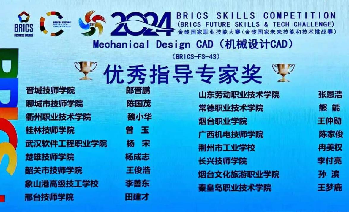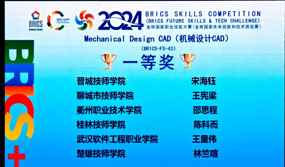 近日,2024金砖国家职业技能大赛(金砖国家未来技能和技术挑战赛)机械设计CAD赛项国际总决赛圆满落幕。太阳成集团tyc234cc传来喜讯,邵思程老师凭借出色表现荣获该赛项一等奖,指导教师被授予优秀指导专家称号。