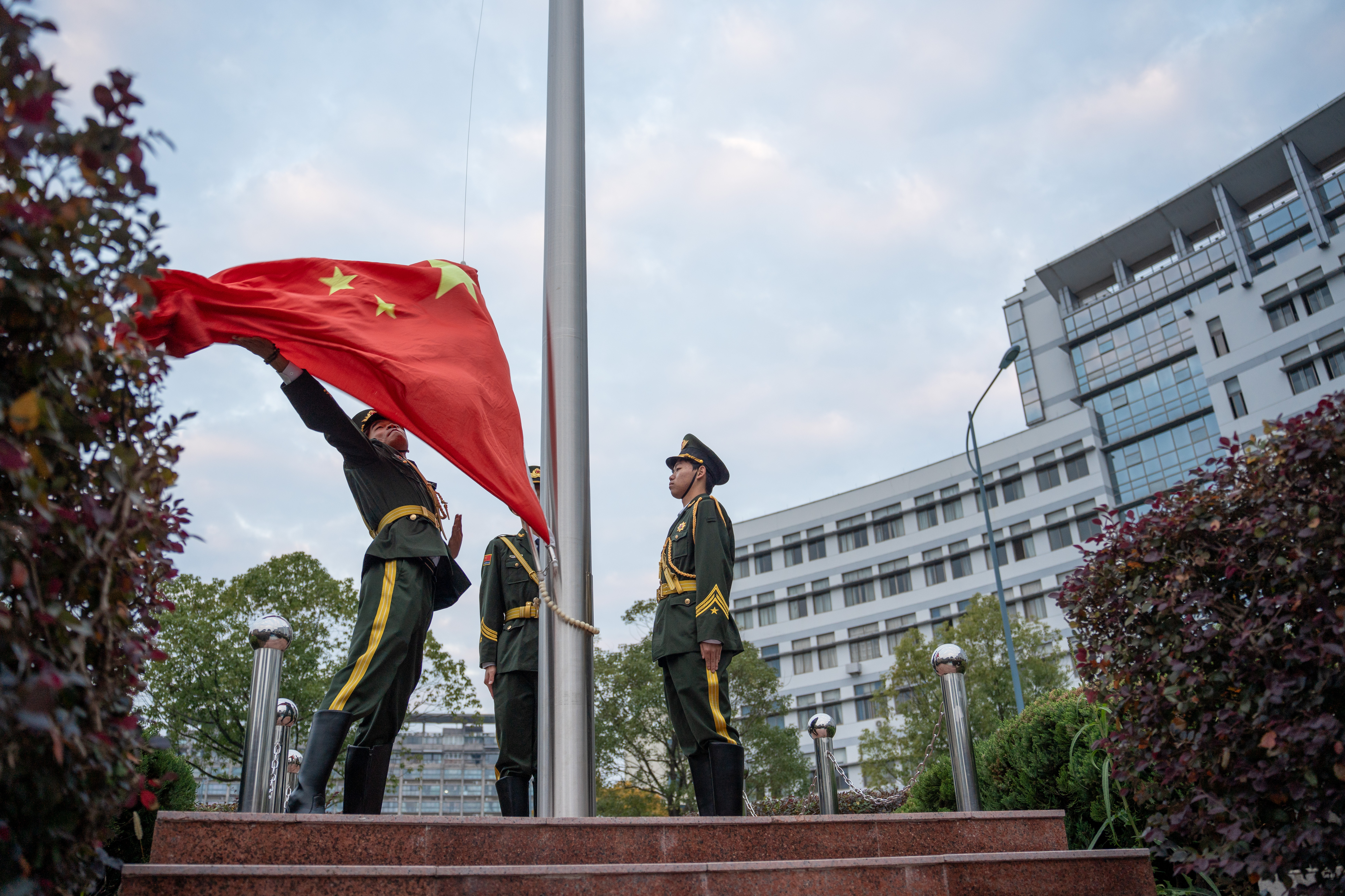随着国歌奏响,全场师生齐声高唱,在雄壮的国歌声中,鲜艳的五星红旗冉冉升起,在熠熠晨光中迎风飘扬。升旗仪式展现出了全场师生对革命先烈的崇高敬意以及对祖国的无限热爱。